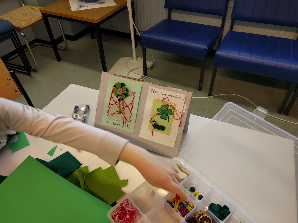 Tutuiksi tulleissa tiloissamme Kansainvälisellä Toimintakeskuksella järjestimme koko perheen askartelutapahtuman 28.2.2016. Askartelupöydissä innostuneiden lasten käsissä sakset ja maalit vilahtelivat ja koristeet löysivät paikkansa, useimmiten ihan neuvomattakin. Kyllä lasten mielikuvitus on ihmeellinen, ja toivottavasti heidän tekemänsä Marțișorit ilahduttavat nyt rakkaita naisia lähipiirissä: äitejä, mummuja, kummeja ja ystäviä. Oma poikani toi minulle itse keksimänsä kortin, jossa kylläkin seikkaili perhosen asemesta jonkun pelin hahmo nimeltä Destroyer…mutta ei se mitään, kun korttia kiersi punavalkoinen nauha, joka on Marțișorin tunnusmerkki.